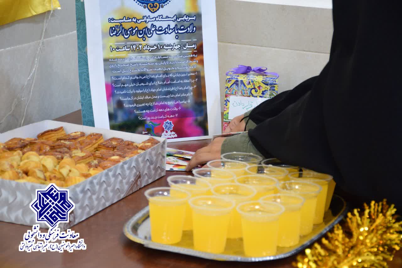 جشن میلاد امام رضا علیه السلام باهمکاری وحضور پرشور بسیج دانشجویی خواهران دانشگاه ،حضور اساتید و پرسنل محترم دانشگاه امیرالمومنین با سخنرانی معاونت فرهنگی دانشگاه جناب آقای حجت الاسلام و المسلمین سروستانی ،برپایی ایستگاه صلواتی ،برگزاری مسابقات فرهنگی ،دیوار نوشته امام رضایی ها ، اهدای جوایز وخواندن دسته جمعی زیارت خاصه امام رضا علیه السلام وپخش شیرینی و شربت برگزار شد