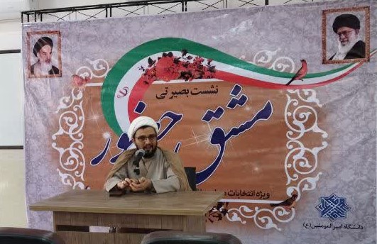 نشست سیاسی بصیرتی مشق حضور برگزار شد در این نشست که با حضور دانشجویان خواهر دانشگاه امیرالمومنین علیه السلام برگزار شد،حجتالاسلام و المسلمین دبیری فرد رئیس دفتر تبلیغات اسلامی استان خوزستان با بیان مقایسه ای جهانی وضعیت امروز کشور با پیش از انقلاب، حضور در صحنه انتخابات را موجب اقتدار کشور عنوان کرد. درپایان این نشست، دانشجویان سوالات و شبهات خودرا مطرح کردند.